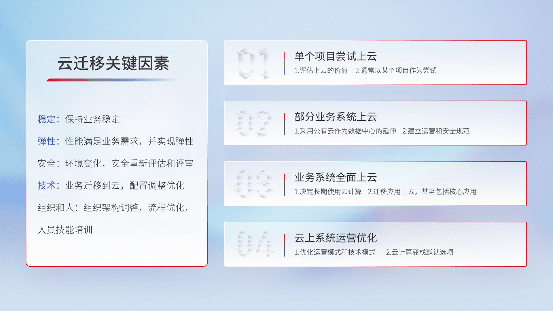 结合实际业务,,,,从规划设计、、、、云平台选型、、云原生改造、、、数据迁移、、、、集成交付,,,迁移全过程为客户识别最佳上云路径,,,做好风险识别管理,,,,设计网络架构、、、、身份权限、、、安全审计合规、、操作审计、、日志审计、、、、监控告警策略、、、多站点容灾设计等,,,,对云上基础设施进行整体规划,,,提升IT治理水平,,,,以满足弹性、、、、高可用、、、、高性能的需求。。